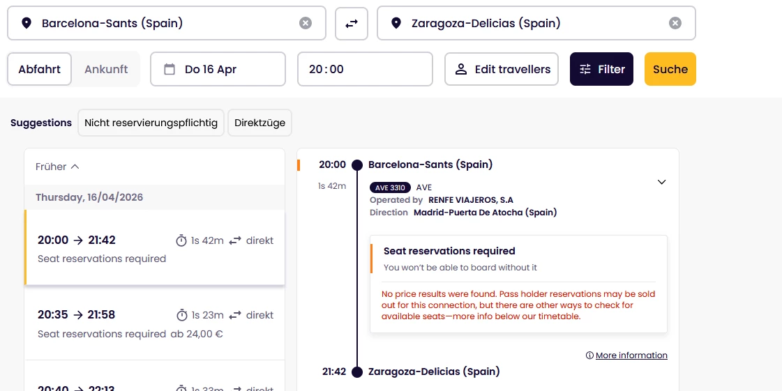 Hallo ich brauche eine Reservierung für den AVE3310 am 16.04.20226 um 20:00 nach Zaragoza:
