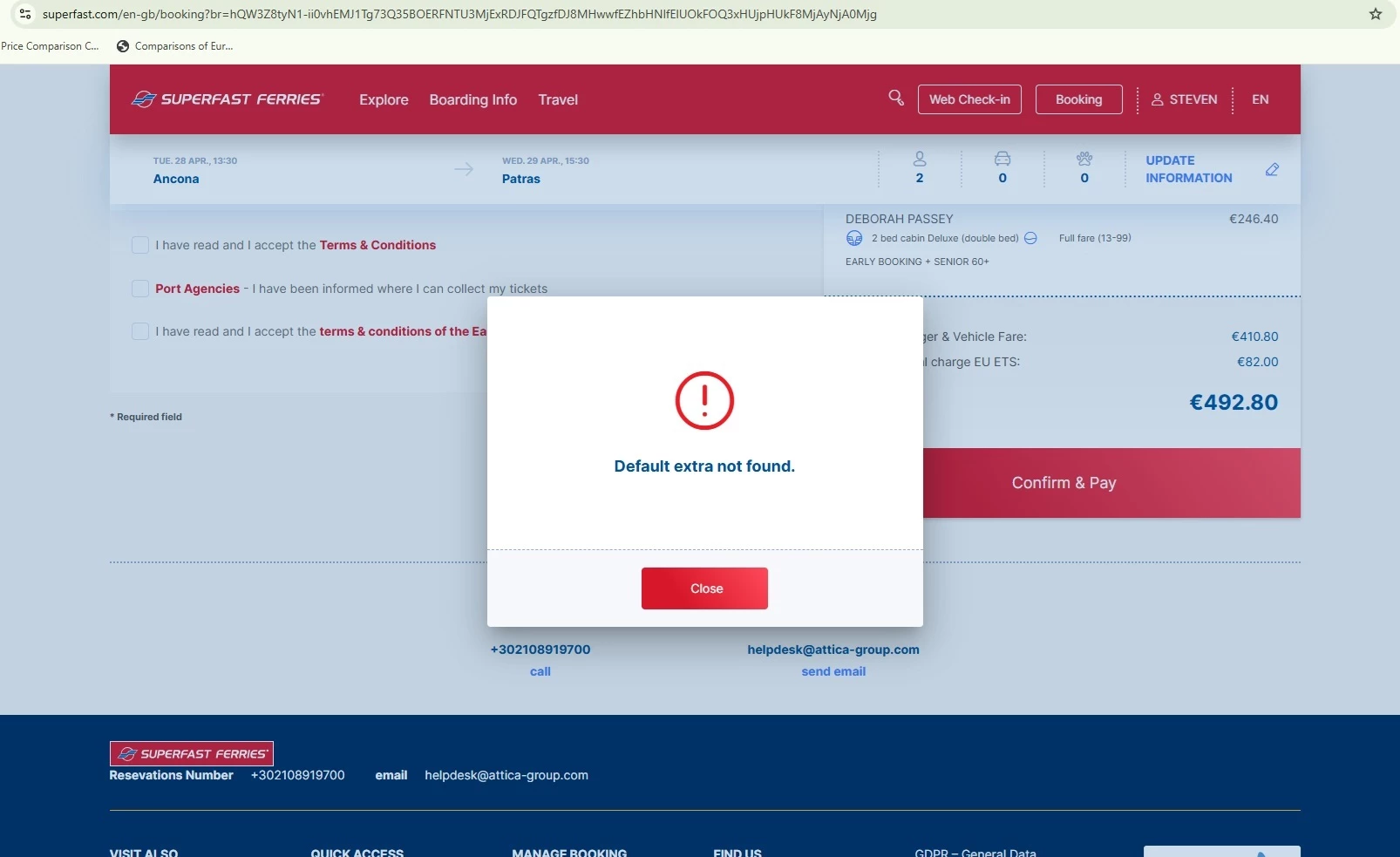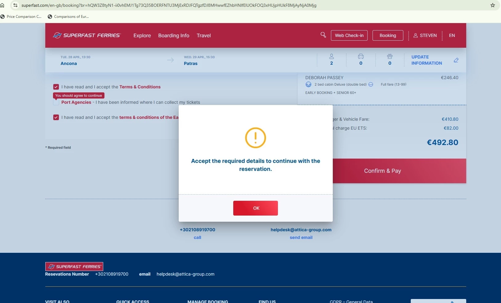 Booking problem; Superfast Ferries - Ancona, Italy to Patras, Greece