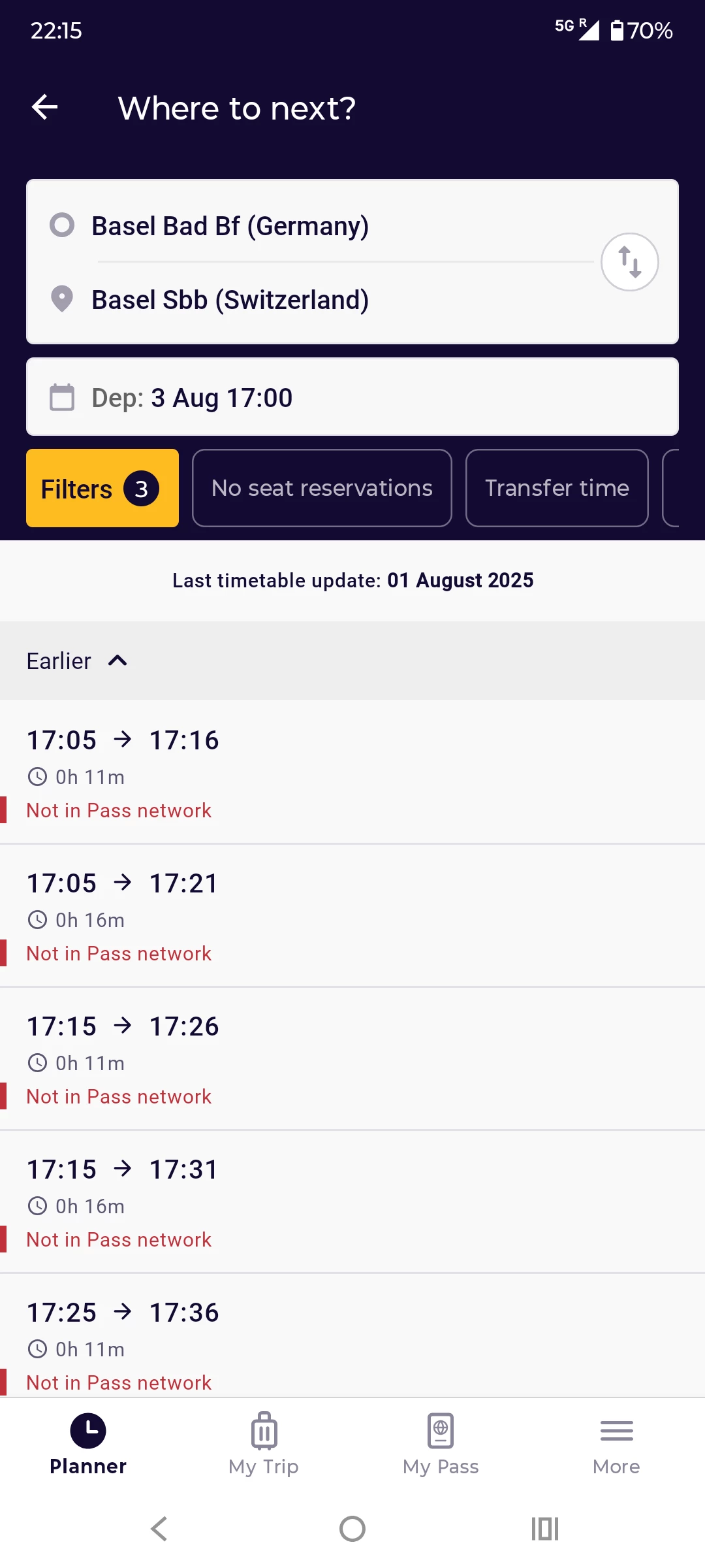 Was just trying to enter my trip for tomorrow into the app, but encountered a bug in the app doing so. When planning from Basel Bad to Basel SBB I only get journeys by tram, even when I apply filters to switch off trams.
