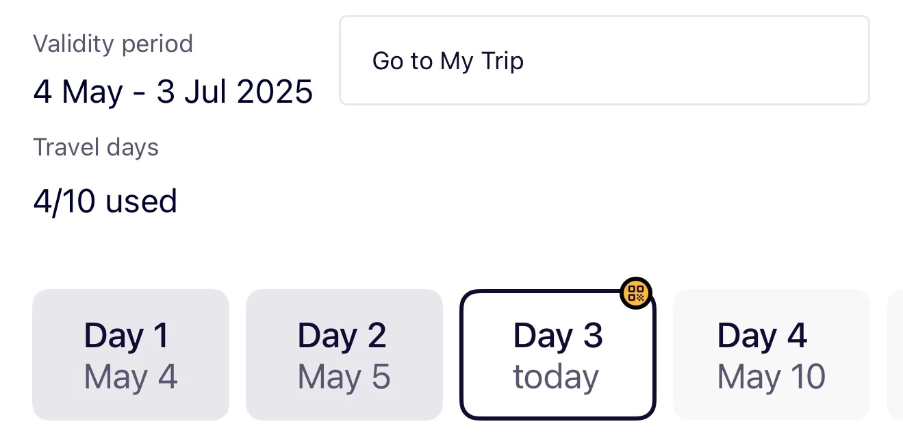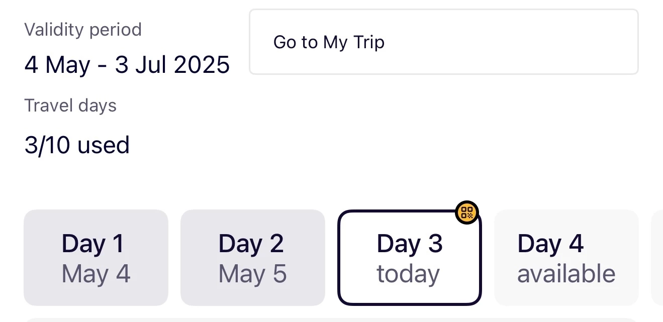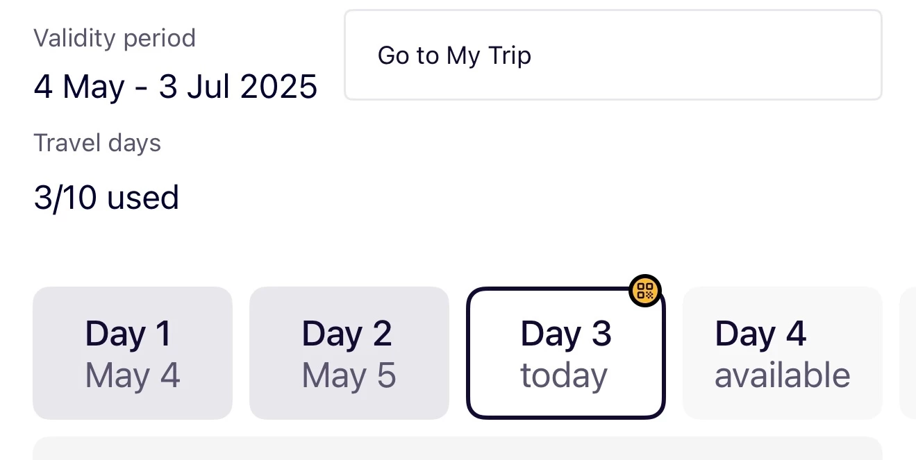 I purchased three Global passes and they are showing different information. Two of them are showing that we have now used 3/10 days and day 4 as “available”. The third one is showing 3/10 days used as well but shows “May 10” under day 4. Why isn’t it showing as available and will it cause any issue? Thank you