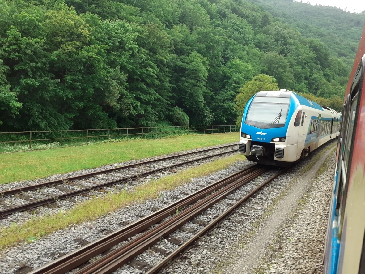 Like so often also this time was rail replacement service for a part of our trip, this time from Villach to Jesenice. The bus left Villach with about 10 minutes delay and passed the Karawanken mountain range and the Austrian-Slovenian border in the Karawanken motorway tunnel paralleling the railway tunnel. As stated in Part 1, there is no information in Jesenice station from which platform a train departs. A friendly traffic manager gave us directions and we boarded the train, like last time a Fiat diesel railcar over and over with graffiti.