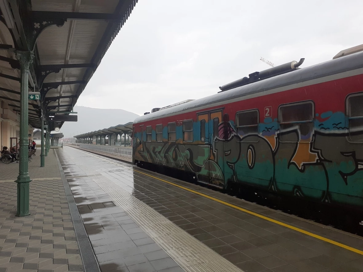 The new border after the Second World War was drawn in such a way that the railway line stayed in Gorizia/Gorica on Yugoslav territory, with the station square cut into two parts by the border. At the beginning secured by barbed wire, later by a fence, which had vanished with EU and the Schengen agreement. On the Yugoslav side of the border the city of Nova Gorica was developed. At heavy rain we reached the Nova Gorica station, the terminal station of our train. Under the title “GO! Borderless” was Nova Gorica together with Gorizia one of the European Capitals of Culture 2025. (The other one was Chemnitz in Germany.) The station had been a construction site at our visit 2024, now new tracks were laid and new platforms connected by an underpass were built.