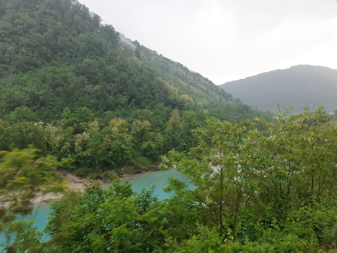 The train passed Lake Bled and arrived after passing the Bohinj tunnel in Podbrdo. This time we could stay on the train travelling in the valley of the river Bača.