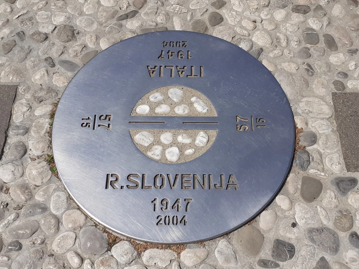 In the centre of the square the location of the actual border line is marked by a plate remembering the years of closure and reopening of the border. The number 57/15 on the plate is the identification number of a stone border marker from 1947 near this place.