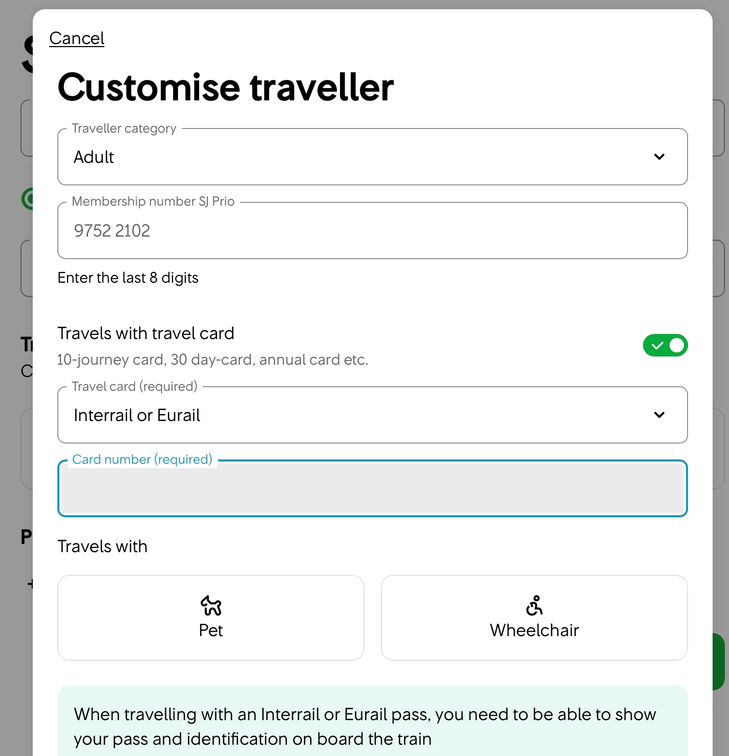 Click where it says ‘Traveller 1’ and then ‘Travels with a travel card’. You can add your rail pass there.