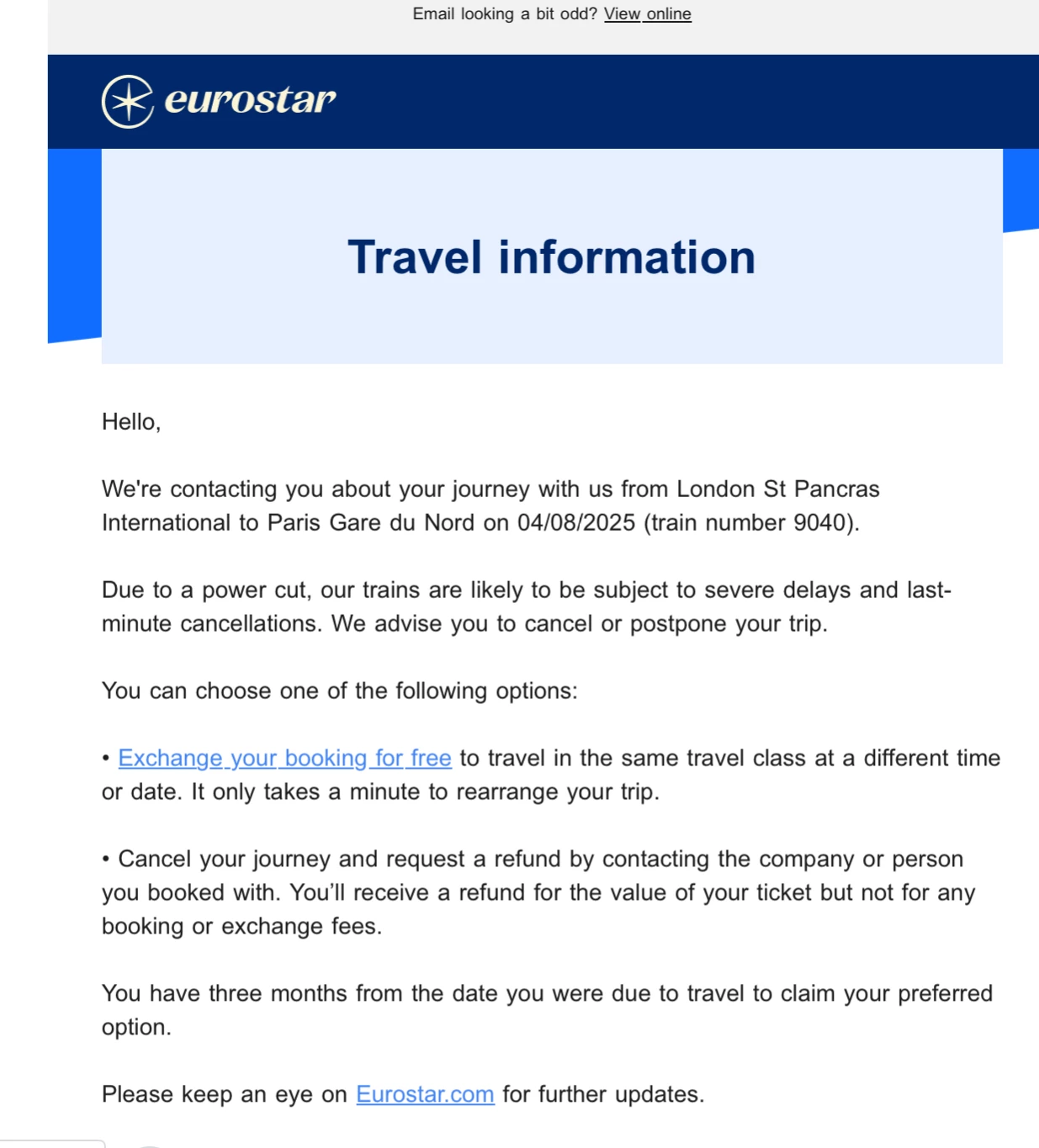 We are due to travel today from Preston - London - Paris -Cannes but have had an email from Eurostar advising us not to.