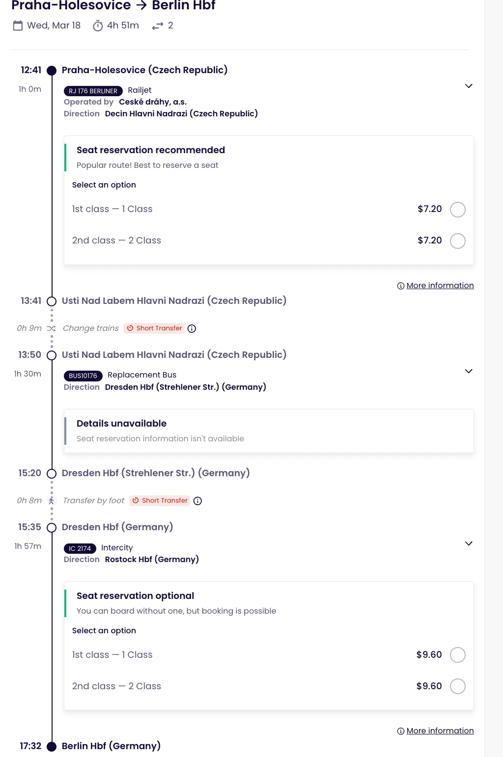 Going from Prague to Berlin, and need to take 3 trains, booked tickets for the first and third trains, but the second one said no ticket, “open seating”. However, I looked today 13MAR for the train on 18MAR and they replaced the second train with a replacement bus. Do I need to book tickets for that replacement bus or what do I need to do?