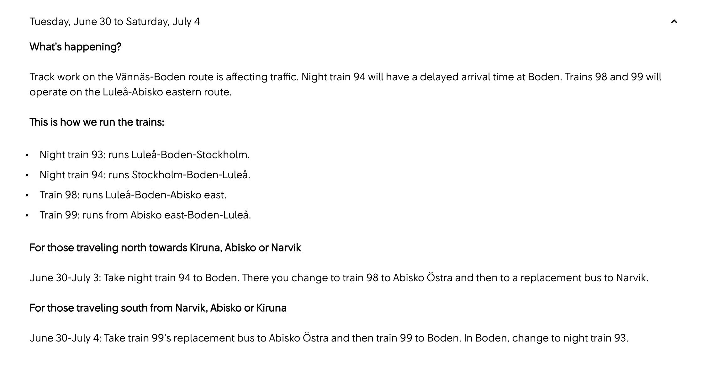 Do you know if there will be night trains between Narvik and Stockholm between June 20th and July 18th? Currently, when I check the sj.se website, there are no available trips for those dates. I haven't been able to find any information about planned track work or if tickets might go on sale later.