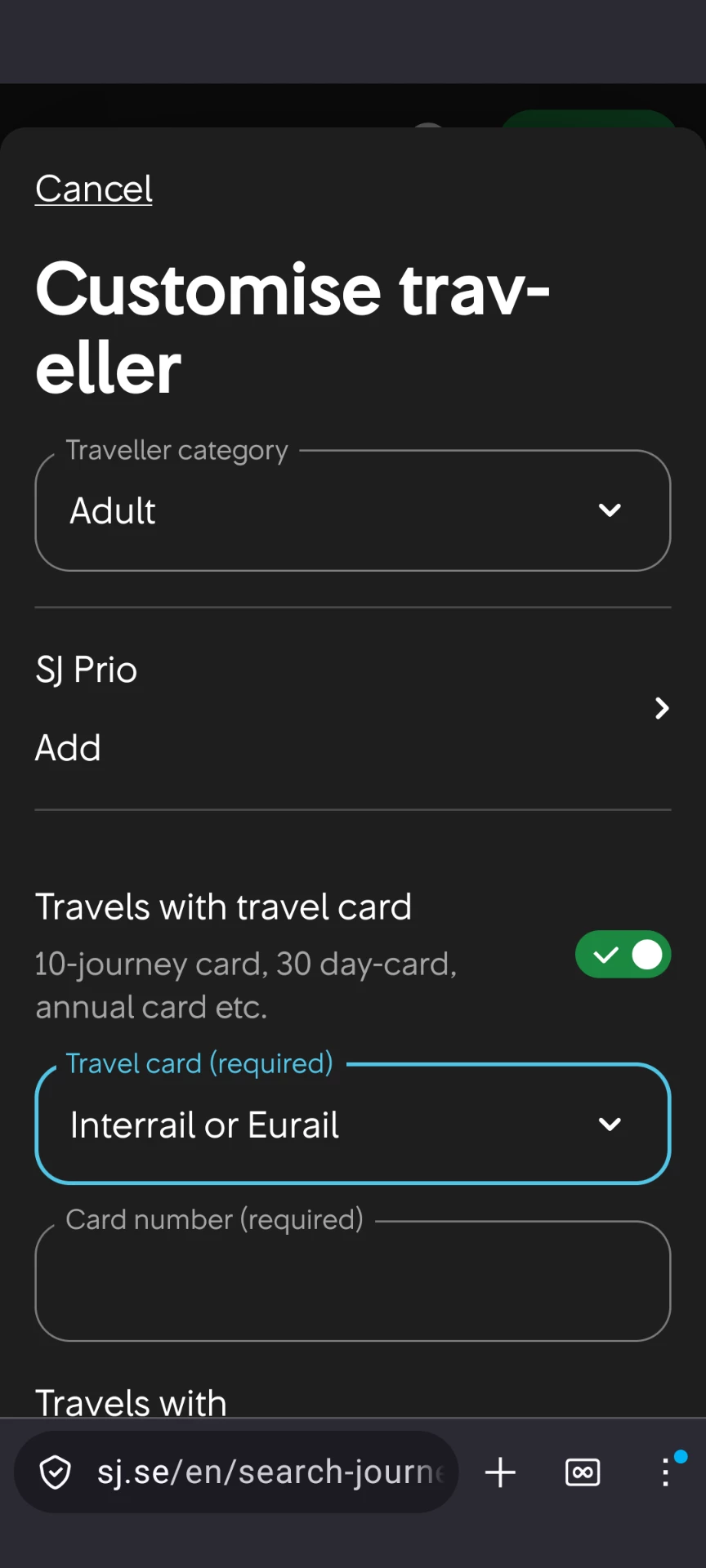 You have to select travel with travel card and add interrail.