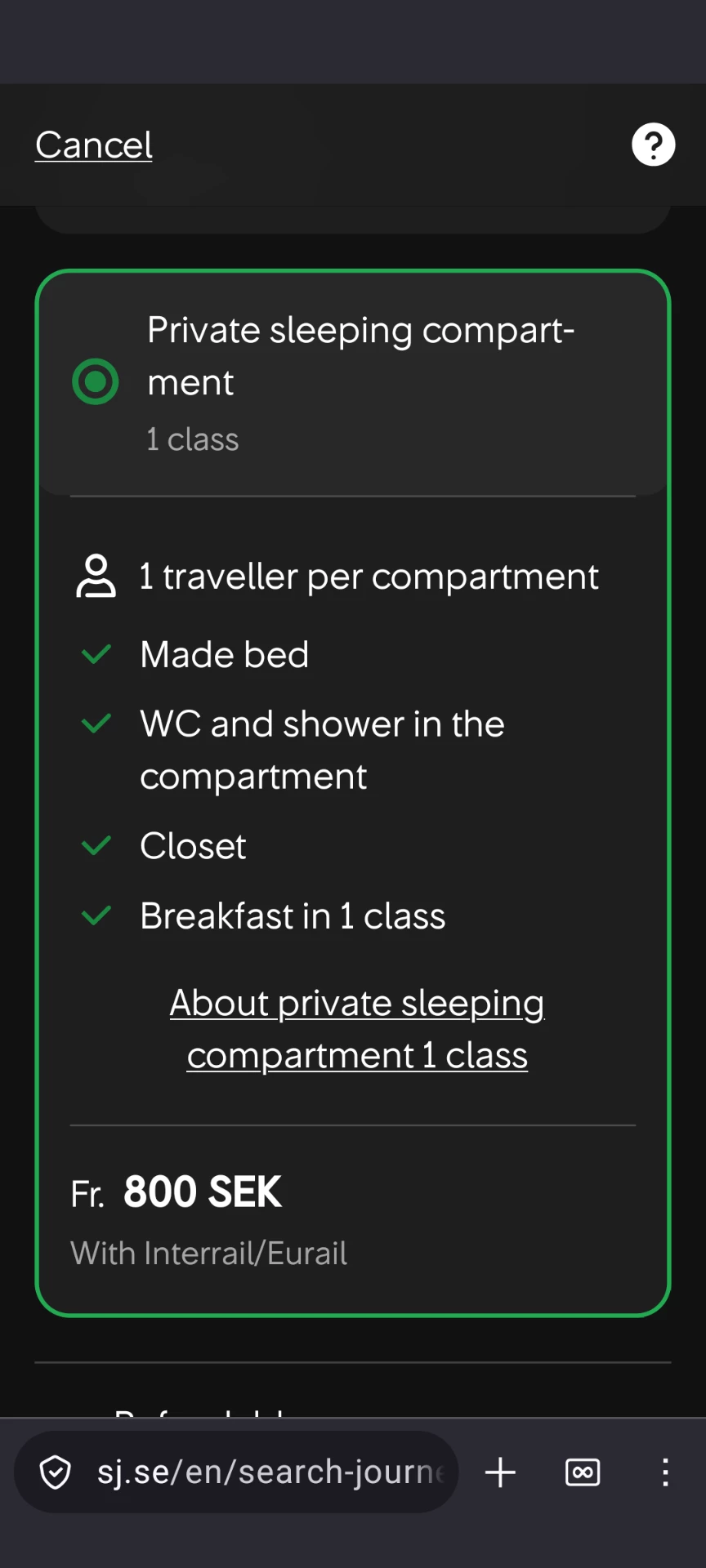 Ich versuche gerade für den Nachtzug NT 94 am 27.05. Von Stockholm nach Boden (Schweden) ein Schlafwagenabteil zu reservieren. Im RailPlaner werden mir aber nur Liegewagenplätze in der 2. Klasse angeboten, obwohl in der Übersicht bei der Zugverbindung Private Schlafwagen aufgeführt sind.