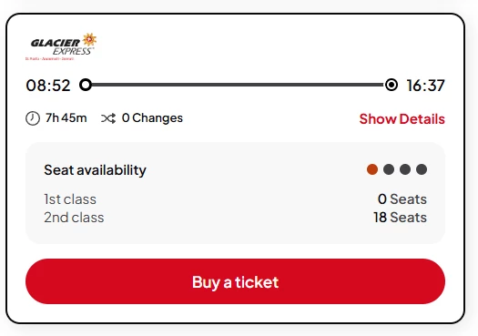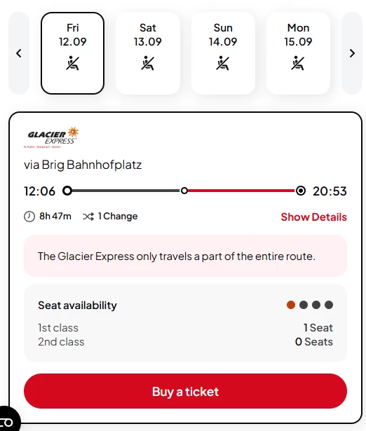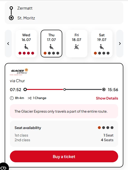I realized that there are no left seats for this day, whereas for next days of July there is plenty, sometimes 2-3, sometimes even 15 or more. That’s kind of weird. Do you know any real answers why is that? Is the Glacier Express team releasing seats week by week or what?
