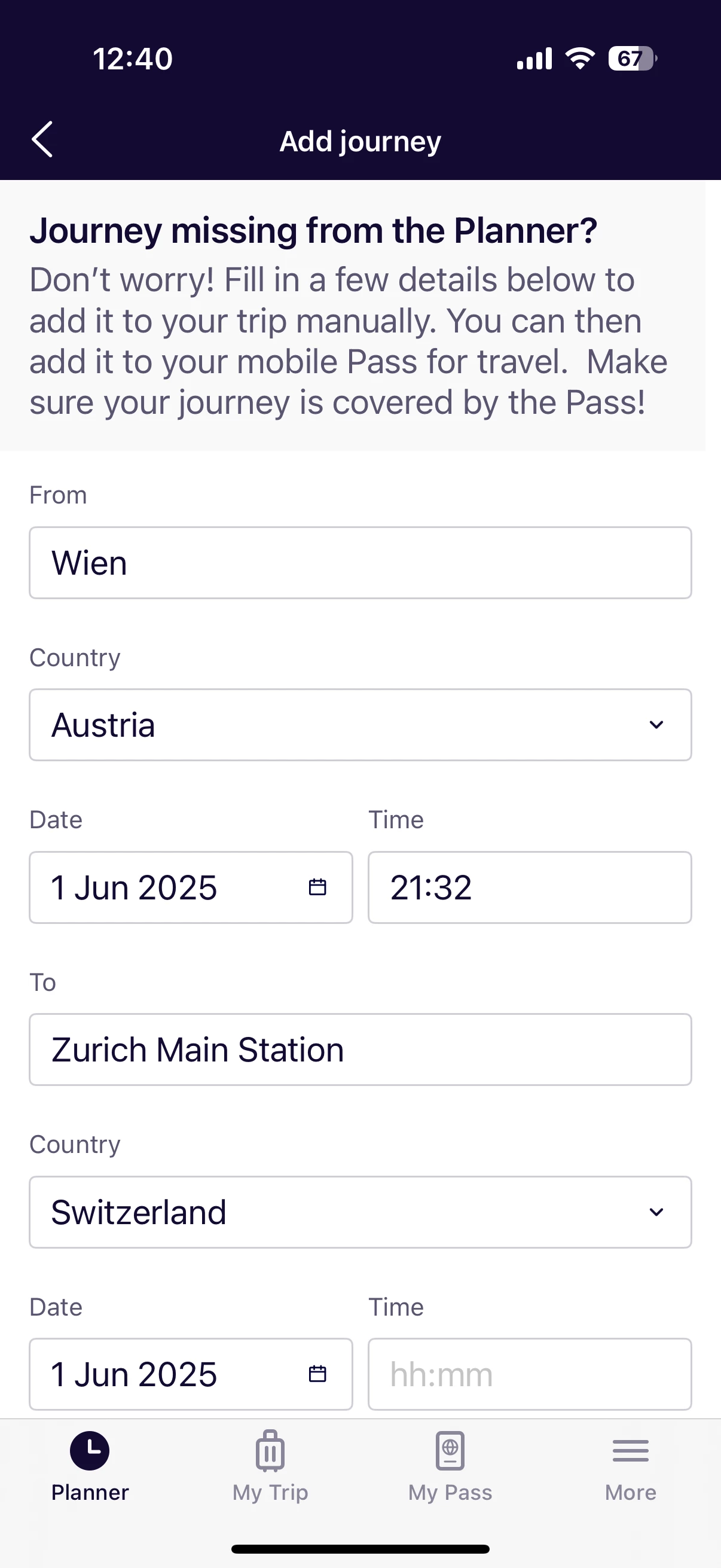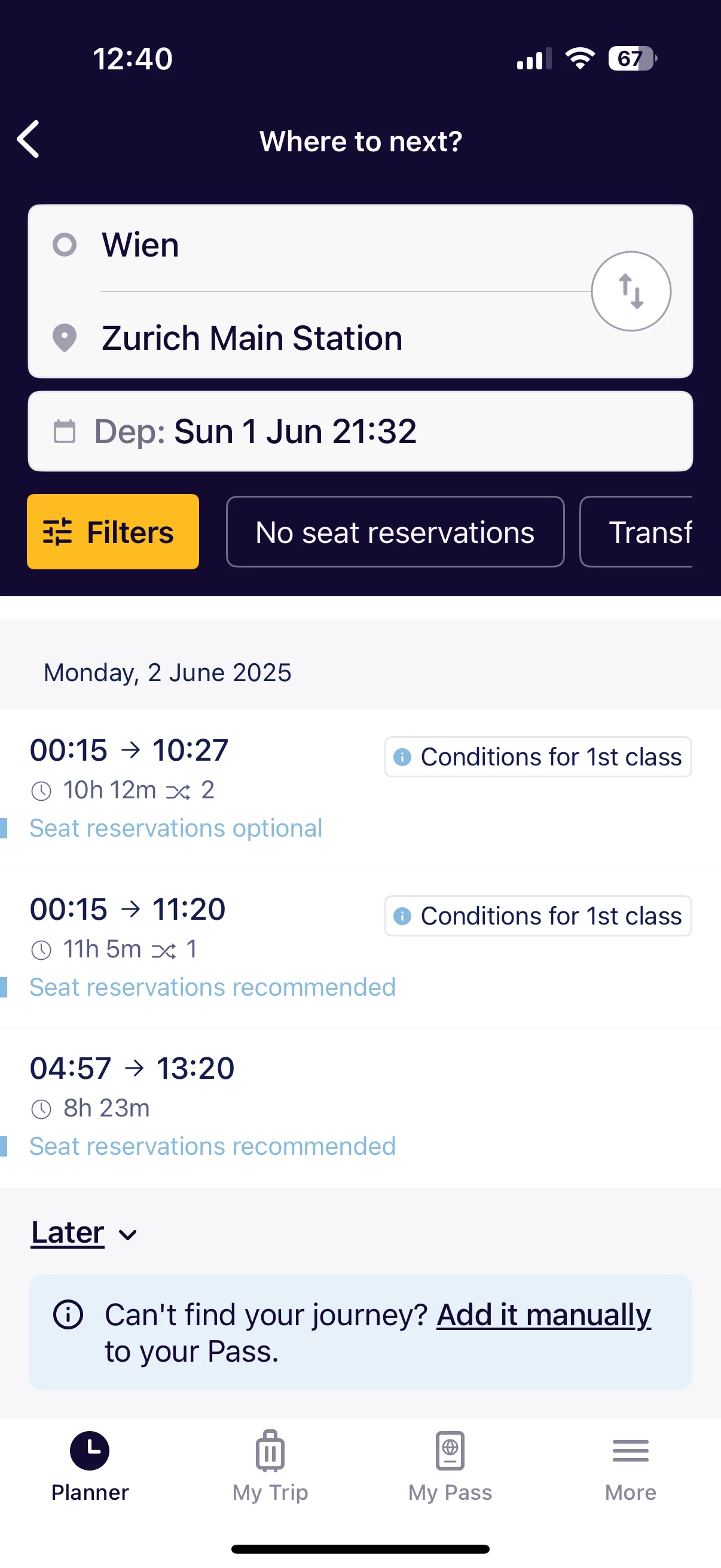 Vienna to Zurich Euronight timetable in Interrail app
